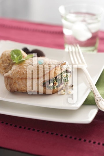A pork chop is stuffed with a Greek filling of spinach, olives and feta cheese.