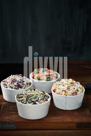 Bowls of gorgonzola slaw, broccoli crunch salad, chopped salad and mediterranean pasta salad are served on a dark wood surface.