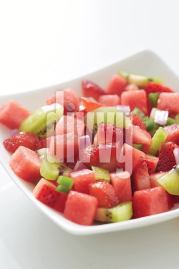 Juicy watermelon salsa includes kiwi, strawberry, onion and jalapeños.