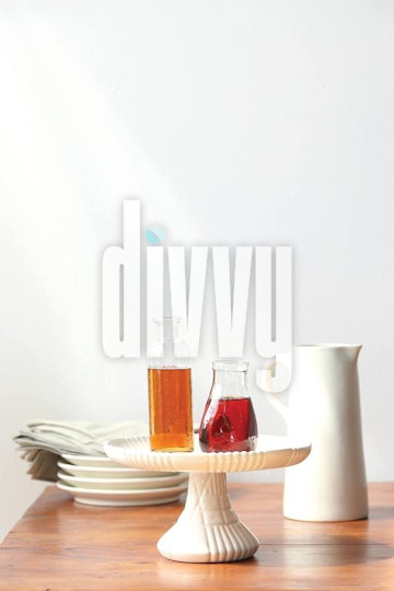 Two different types of maple syrup in glass containers sitting on a cake stand.