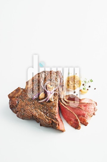 Slices are cut from T-bone steak topped with purple onion and garlic cloves, next to a roasted head of garlic, sprigs of thyme and whole black peppercorns.