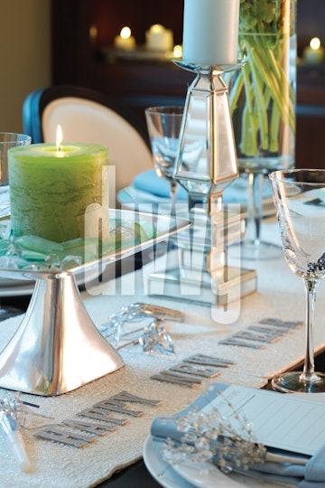 Elegant table set with Happy New Year, monogrammed blue napkins, crystal decor and candles.