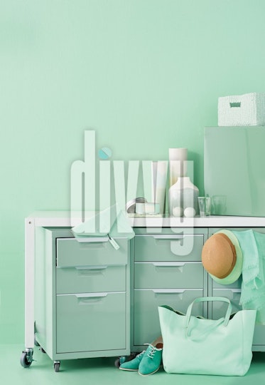 Mint-green colored items are arranged in front of a mint-green wall.