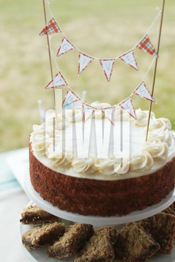 A frosted pumpkin cake with a flag decoration is part of a dessert table at an outdoor fall party.