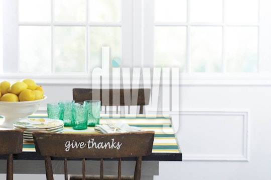 A chair with "give thanks" painted on it is set by a vintage wood table set with a stack of plates and glasses.