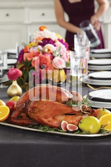 A golden brown baked turkey is surrounded with figs, pears and oranges on a dark table setting with a floral centerpiece.