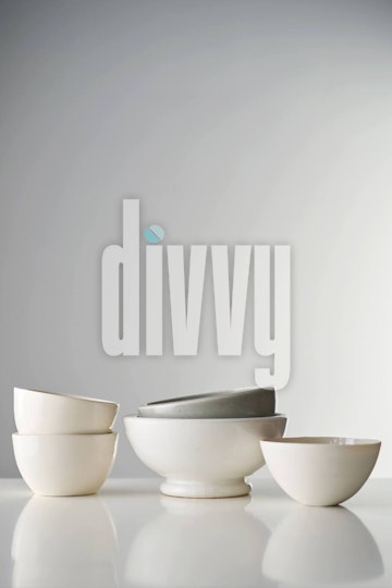 A stack of two white bowls sits beside a stacked white and grey bowl, with a single white bowl on the right arranged in a row on a white surface.