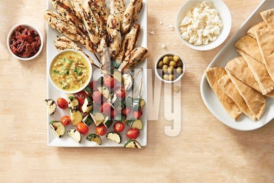 Grilled tomato-zucchini skewers and lemon-herb chicken skewers are served on a light wood table with Greek-herb vinaigrette, sun-dried tomatoes, olives, feta cheese and a plate of pita bread.