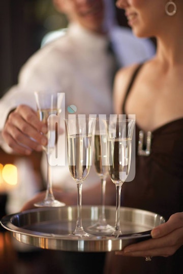A man takes a flute of champagne from a tray served by a woman in a black dress.
