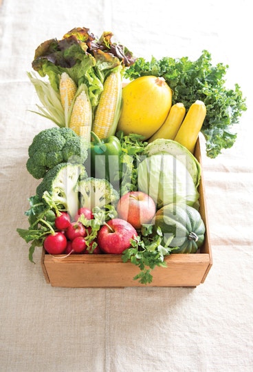 A wooden crate is filled with fresh greens, yellow squash, spaghetti squash, sweet corn, broccoli, peppers, cabbage, radishes, apples, winter squash and herbs.