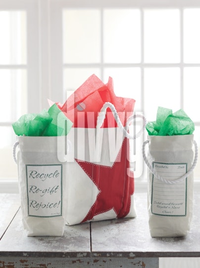 Two tall white cotton gift bags with green tissue paper and large tags beside a larger white gift bag with red star and tissue paper set on top of rustic table.