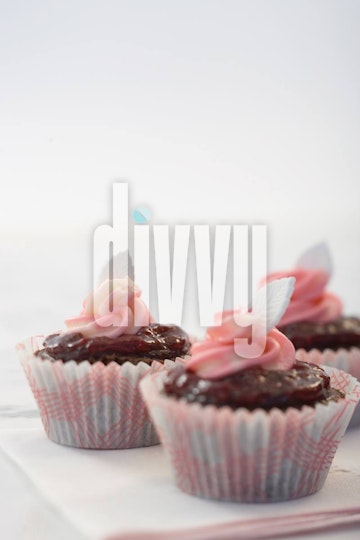 Triple chocolate cupcakes are decorated with raspberry jam, buttercream frosting and a candy leaf.
