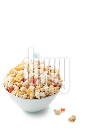 A bowl of popcorn is mixed with dried tropical fruit and cashews.