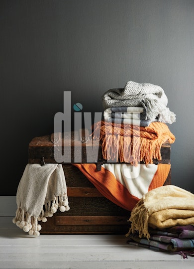 An antique trunk is surrounded with throw blankets.