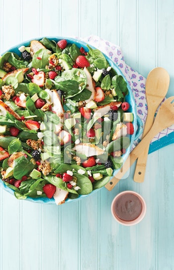A blue bowl is filled with spinach salad containing sliced turkey breast, fresh berries, avocado, and granola and sits next to a wooden fork and spoon and a dish with balsamic vinegar.