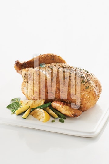 A golden roasted chicken is sprinkled with fresh herbs and served with zucchini, lemon, green beans, and basil garnish on a white platter.