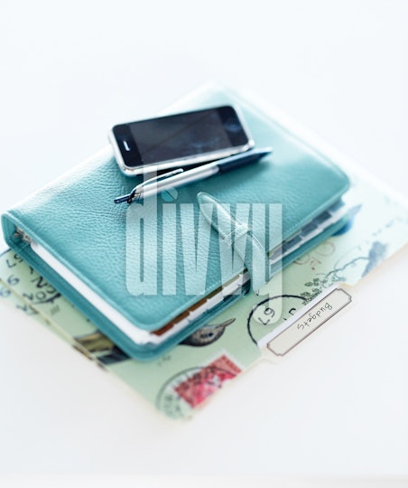 A turquoise leather organizer sits on a decorated folder with a phone resting on top.