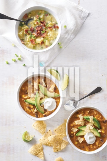 Two bowls of chicken-black bean tortilla soup are topped with avocado and sour cream and flanked by limes and tortilla chips, next to a bowl of corn chowder toped with bacon on a white table.