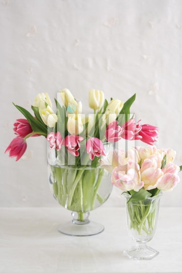 Two different sized glass vases filled of colorful tulips in light pink, magenta and yellow sit on a white table.