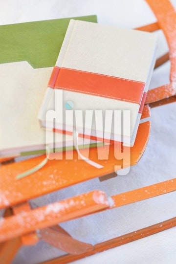 One white and orange journal rests on top of green and white journal stacked on the orange sled in the snow.