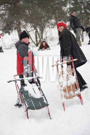 Two kids look back as they pull vintage sleds up a snowy hill.