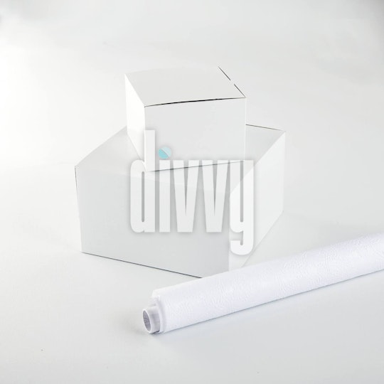 Two white cardboard cake boxes stacked with a roll of white wrapping paper beside them.