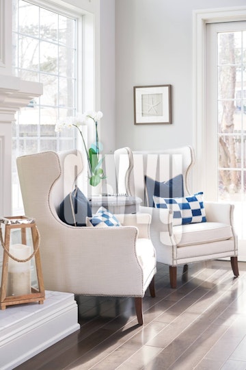 Two white nailhead chairs with blue throw pillows sit on either side of grey table with orchid plant in front of large windows in living room.