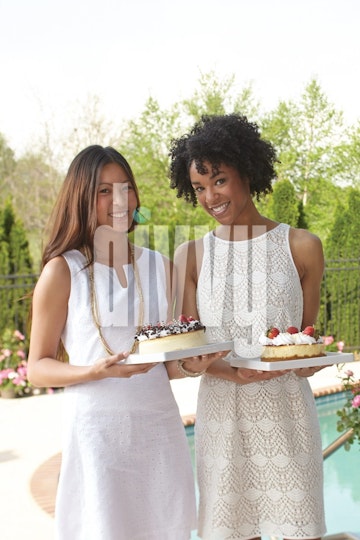 Two women hold cheesecakes at a poolside party.