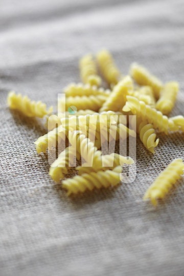 Uncooked rotini pasta is scattered on a burlap tablecloth.