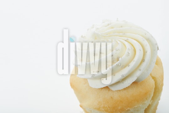 A vanilla mini cupcake is topped with white frosting and silver sprinkles.