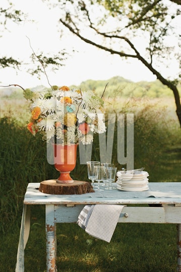 A orange vase filled with an autumnal floral arrangement sits on a antique table outside with plates, glasses and silverware for a outdoor meal.
