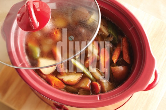 The lid is tipped off a red slow cooker to reveal a beef pot roast and root vegetables cooking in a beef broth.