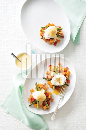 A twist on eggs Benedict, poached eggs are served on top of asparagus and sweet potato hash and covered with hollandaise sauce.
