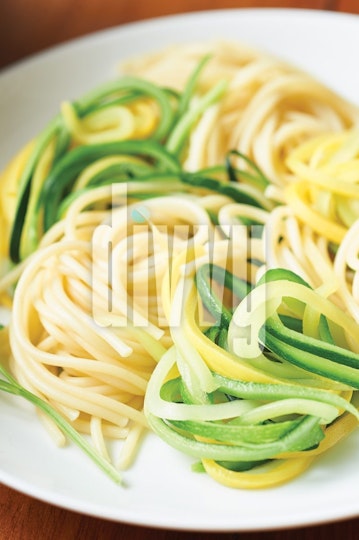 Homemade squash and zucchini noodles are curled next to flour noodles on a white plate.