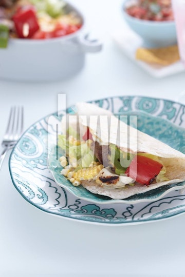 Vegetables and beef fill a taco made with a homemade tortilla on a blue plate with kabobs and chips and salsa on a platter in the background.