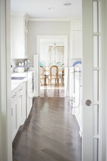A look from pocket doors onto an all white kitchen with stainless steel hardware and marble countertops, all the way to the formal dining room featuring a wood table, blue glass centerpieces and chandelier.