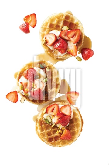 Three toaster waffles are topped with maple syrup, whipped cream, fresh strawberries and pistachios.