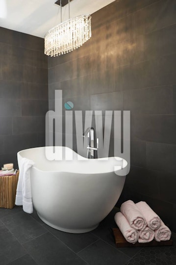 A chandelier hangs over a pedestal tub in a dark tile bathroom with towels and candles.