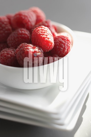 Large fresh raspberries fill a white bowl on top of a stack of white plates.