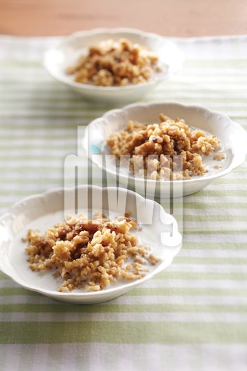 Three white bowls of steel-cut oatmeal topped with milk and nuts are served on a green plaid tablecloth.