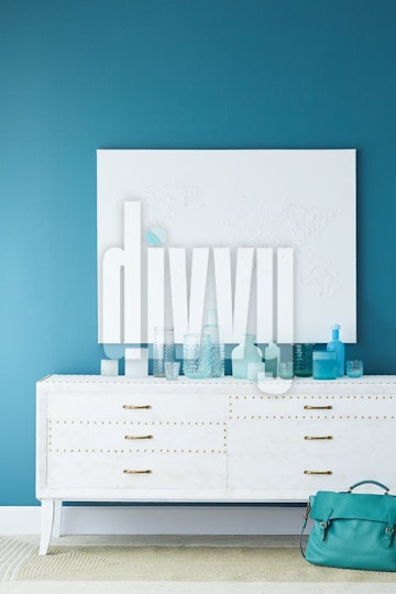 Assorted blue jars are collected on top of a white dresser gold accents, in front of a blue wall with a textured world map hanging.