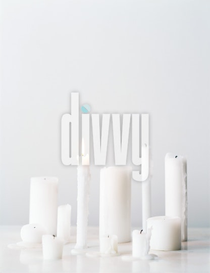 One lit candle amongst ten candles of varying shapes and sizes arranged on a white background.