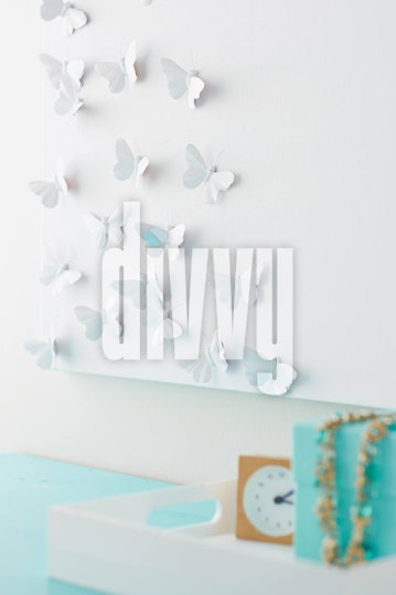 White Butterflies on Canvas Art Hanging above Turquoise Dresser