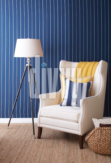 A traditional white chair sits next to a tripod floor lamp in front of a blue pinstriped wall.