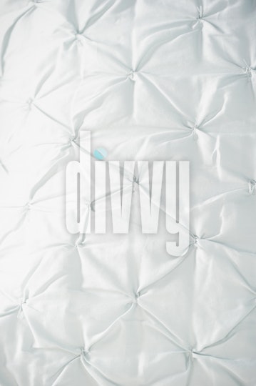 A white pin tucked comforter on a bed.