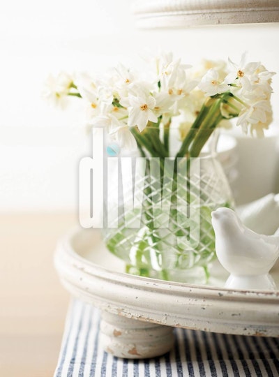 Paperwhite narcissus flowers are gathered in a cut glass vase that sits on top of a white wood stand next to a small ceramic bird.