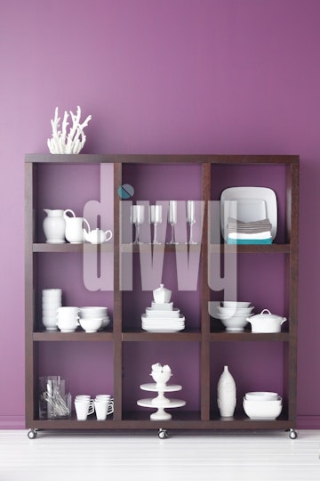 White dishes are displayed in compartments on wood shelves with a purple background.