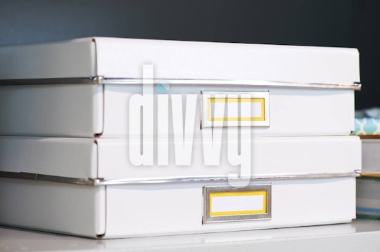 Two office organizers with silver ending and yellow accents sit stacked on a shelf.
