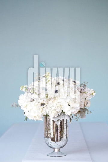 A floral arrangement of white hydrangeas and anemone flowers is displayed in a silver mercury glass vase in front of a light blue wall.