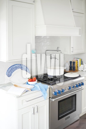 All white kitchen with stainless steel hardware, gas stove with blue turners, pot filler and white marble countertops displaying decorative plates, navy salt and pepper shakers and cookbooks.